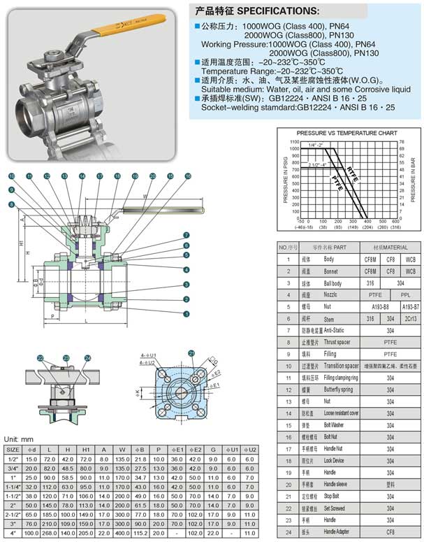 承插焊球閥,三片式承插焊球閥結(jié)構(gòu)圖與尺寸表